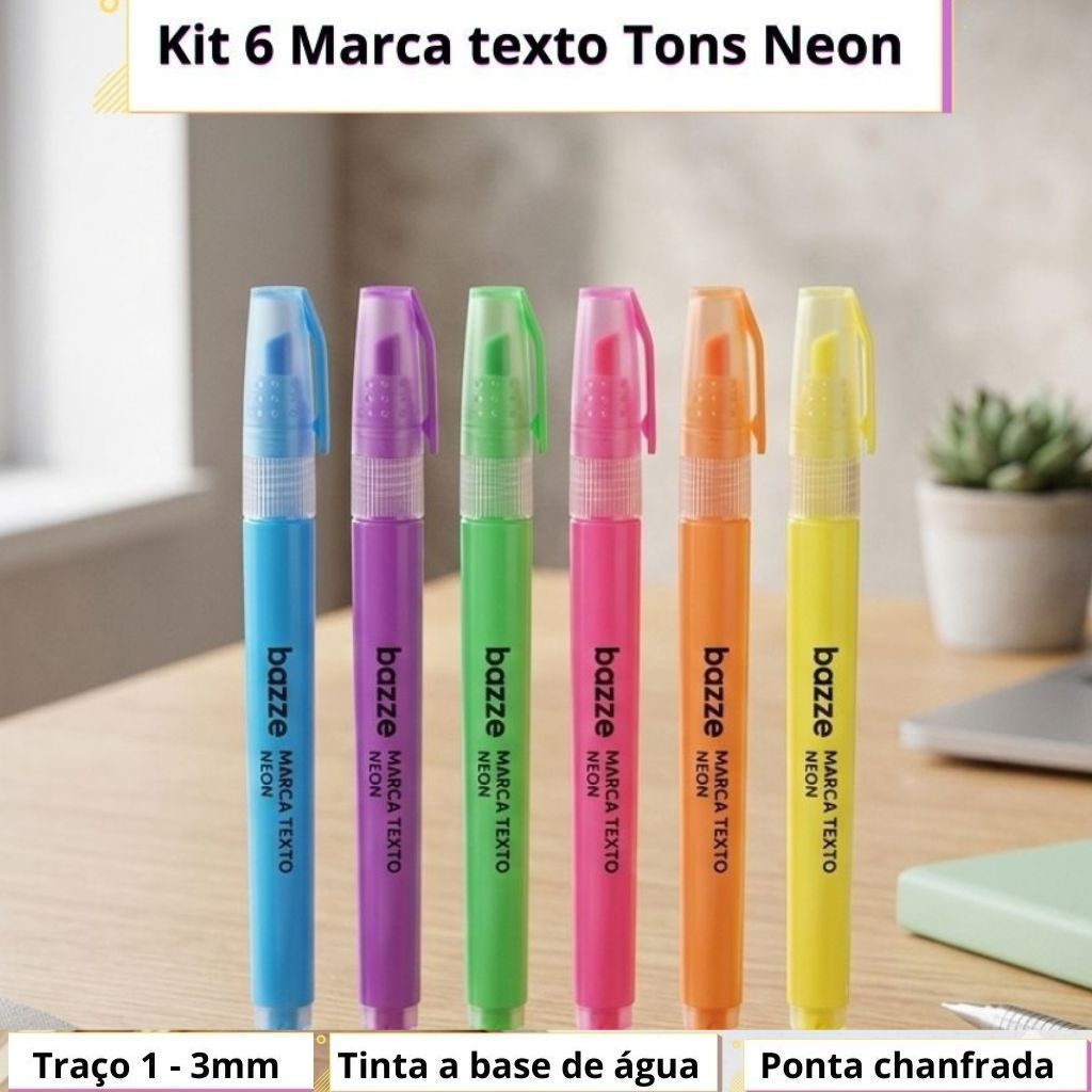 Composto por 6 cores intensas e fluorescentes (Azul, Roxo, Verde, Rosa, Laranja e Amarelo), este kit foi desenvolvido para quem precisa de visibilidade máxima em seus estudos ou documentos.