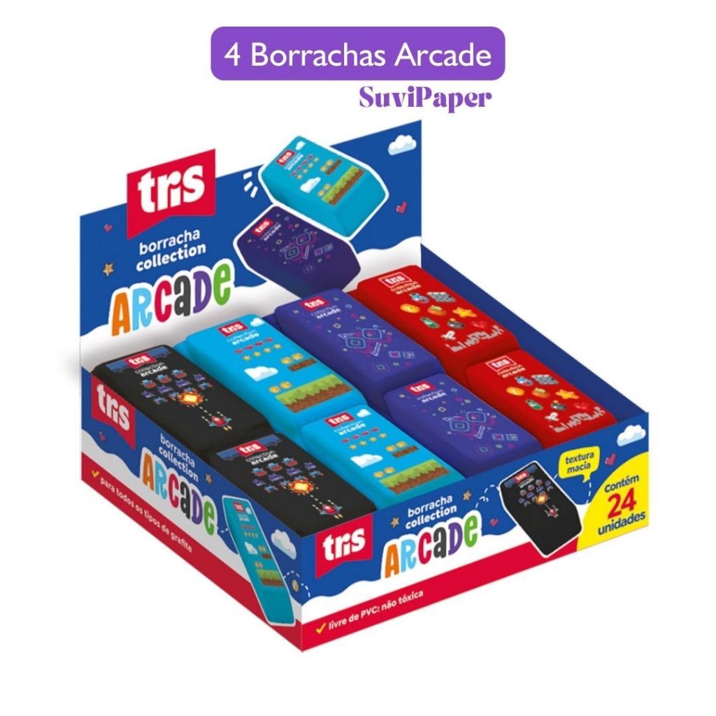 A Borracha Collection Arcade é inspirada em videogames clássicos e é perfeita para todos os tipos de grafite. Com textura macia e corpo em 4 estampas. Suas dimensões são 6x2,4x1 cm. Possui 4 combinações incríveis para escolher, além de ser livre de PVC, atóxica e ter textura macia