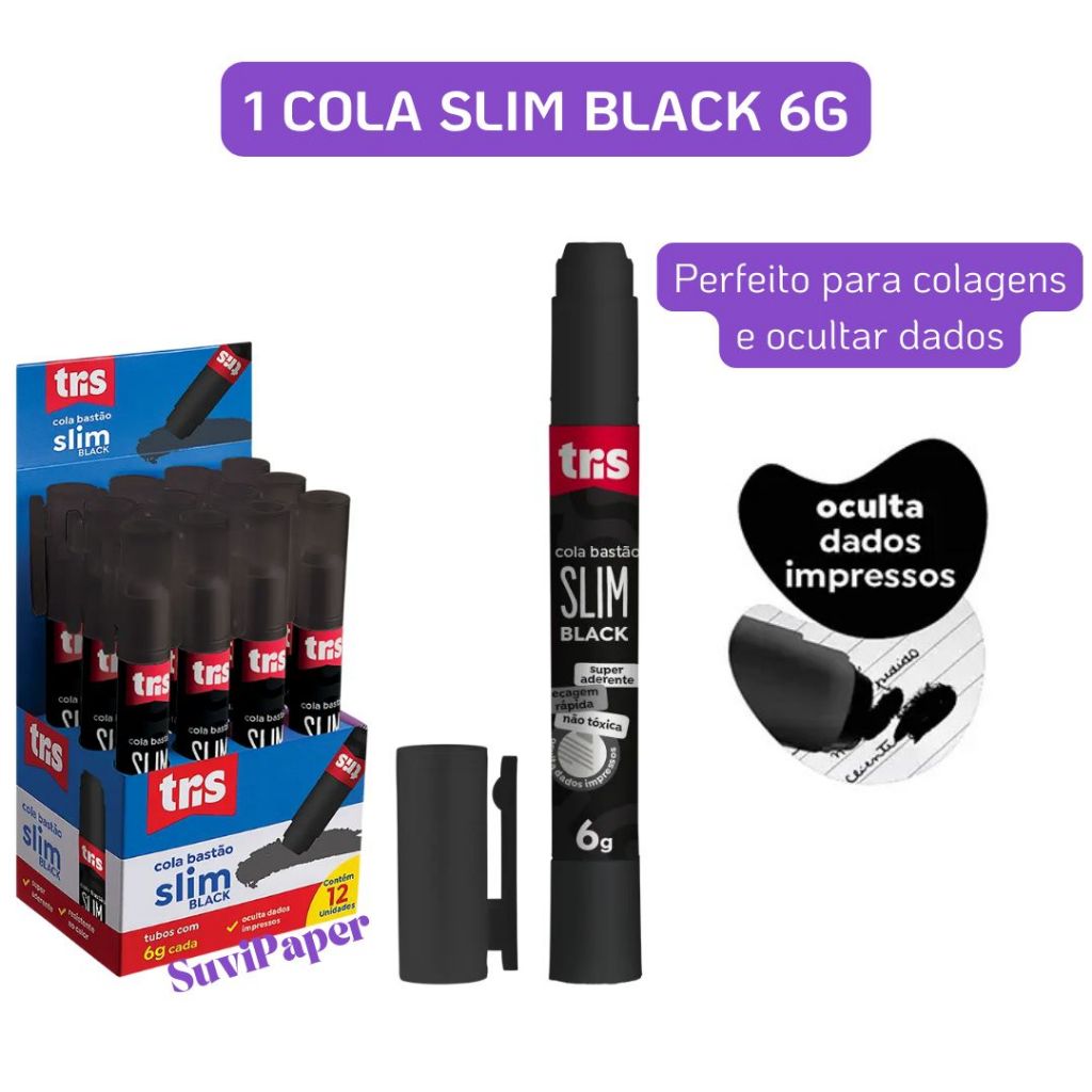 Cola Bastão Tris Slim Black 6g 2 em 1 – 1 Unidade Cola Preta que Oculta Dados Impressos