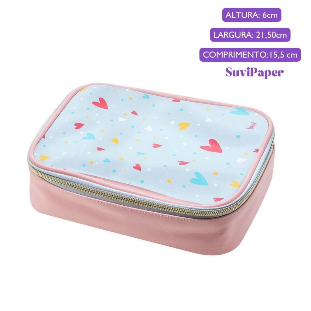 O desenho de coração no tecido traz um toque feminino e charmoso. Feita em material de alta qualidade (PU), essa nécessaire garante durabilidade e resistência. Ideal para levar na bolsa, em viagens ou no dia a dia. Aproveite essa oportunidade de ter uma nécessaire funcional e cheia de estilo!