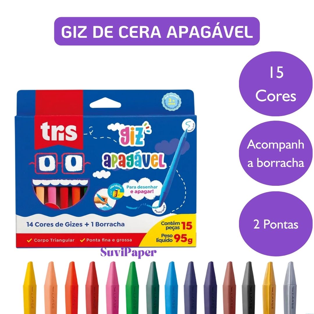 Giz Apagável – 12 Cores Regulares + 2 Cores Metálicas + Borracha – Tris