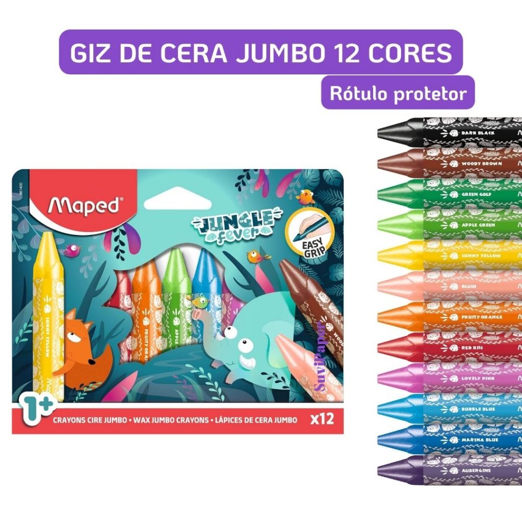 O Giz de Cera Jungle Fever Jumbo da Maped é ideal para despertar a criatividade das crianças desde os primeiros anos. Com cores vibrantes e brilhantes, este conjunto de 12 gizes foi desenvolvido especialmente para mãos pequenas, facilitando a pega e o controle durante o desenho.