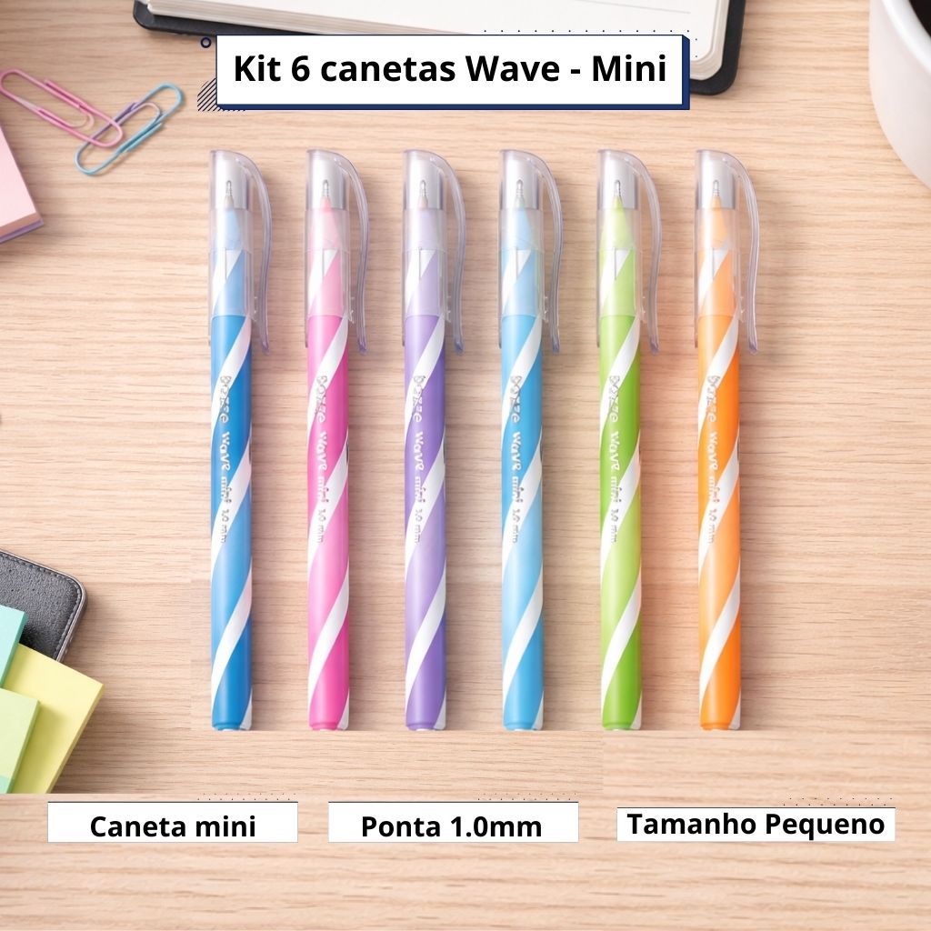 O Kit de Canetas Esferográficas Wave Mini 1.0mm possui design compacto, cores vibrantes e escrita extremamente macia, ideal para estudos, escritório e uso diário.
