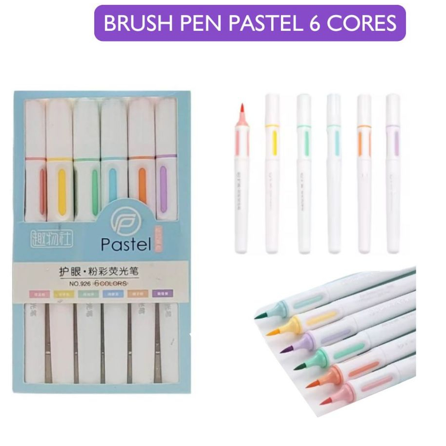- Conteúdo: 6 canetas brush em tonalidades pastel (Amarelo, Azul, Laranja, Rosa, Verde e Lilás)